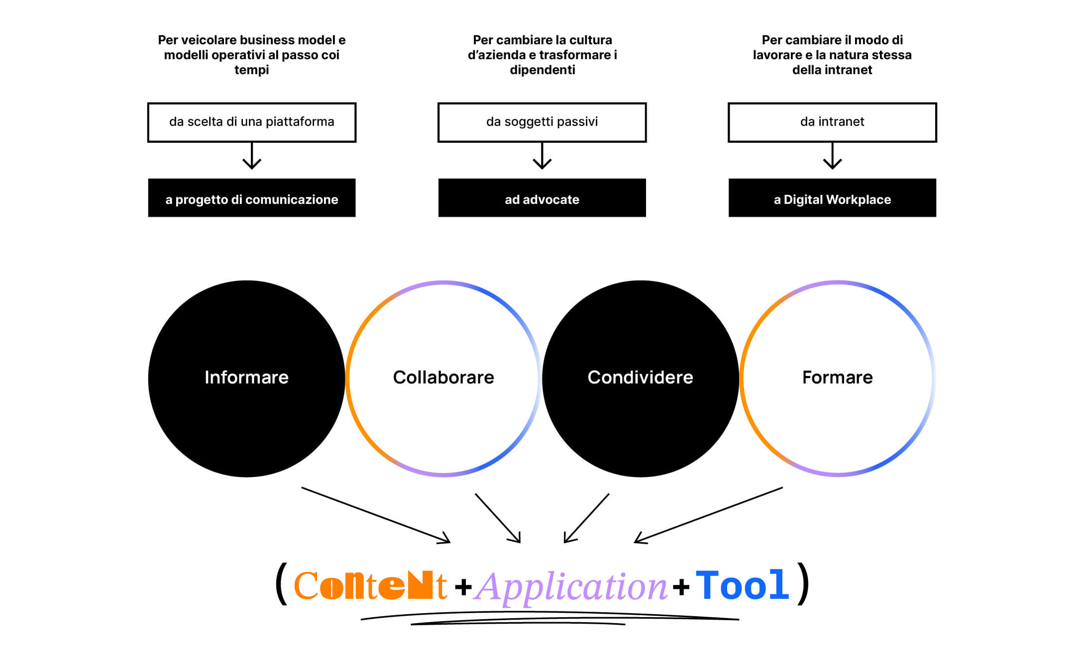 Le modalità e i canali attraverso cui si entra nello "spazio aziendale" sono cambiati molto a seguito dell'evoluzione dei modelli organizzativi causata dal Covid e dalla remotizzazione del lavoro. Le intranet "classiche", prevalentemente informative, sono state affiancate - se non sopravanzate - dagli spazi collaborativi messi a disposizione da applicazioni come Microsoft Teams all'interno dell'ecosistema Microsoft 365 (di cui fa parte anche SharePoint, una delle piattaforme più diffuse per costruire i portali aziendali), Miro, Google Workspace, ecc.