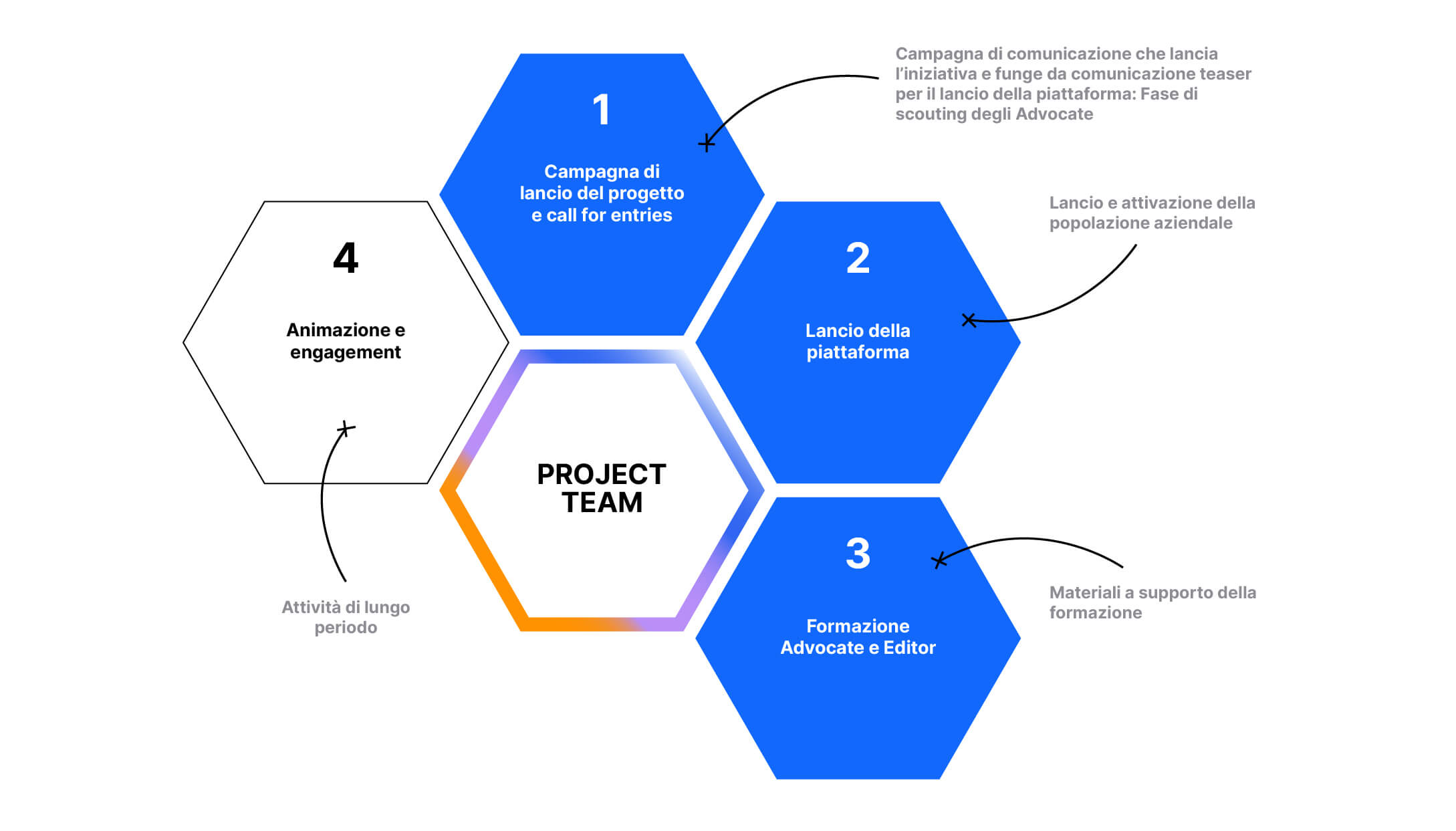 È necessario sviluppare una strategia di lancio che supporti il progetto in tutte le sue fasi e verso tutti i destinatari: dalle fasi di pre-roll alle sessioni di informazione/formazione degli Advocate, dagli annunci formali ai dipendenti alle comunicazioni peer to peer alle altre attività interne.