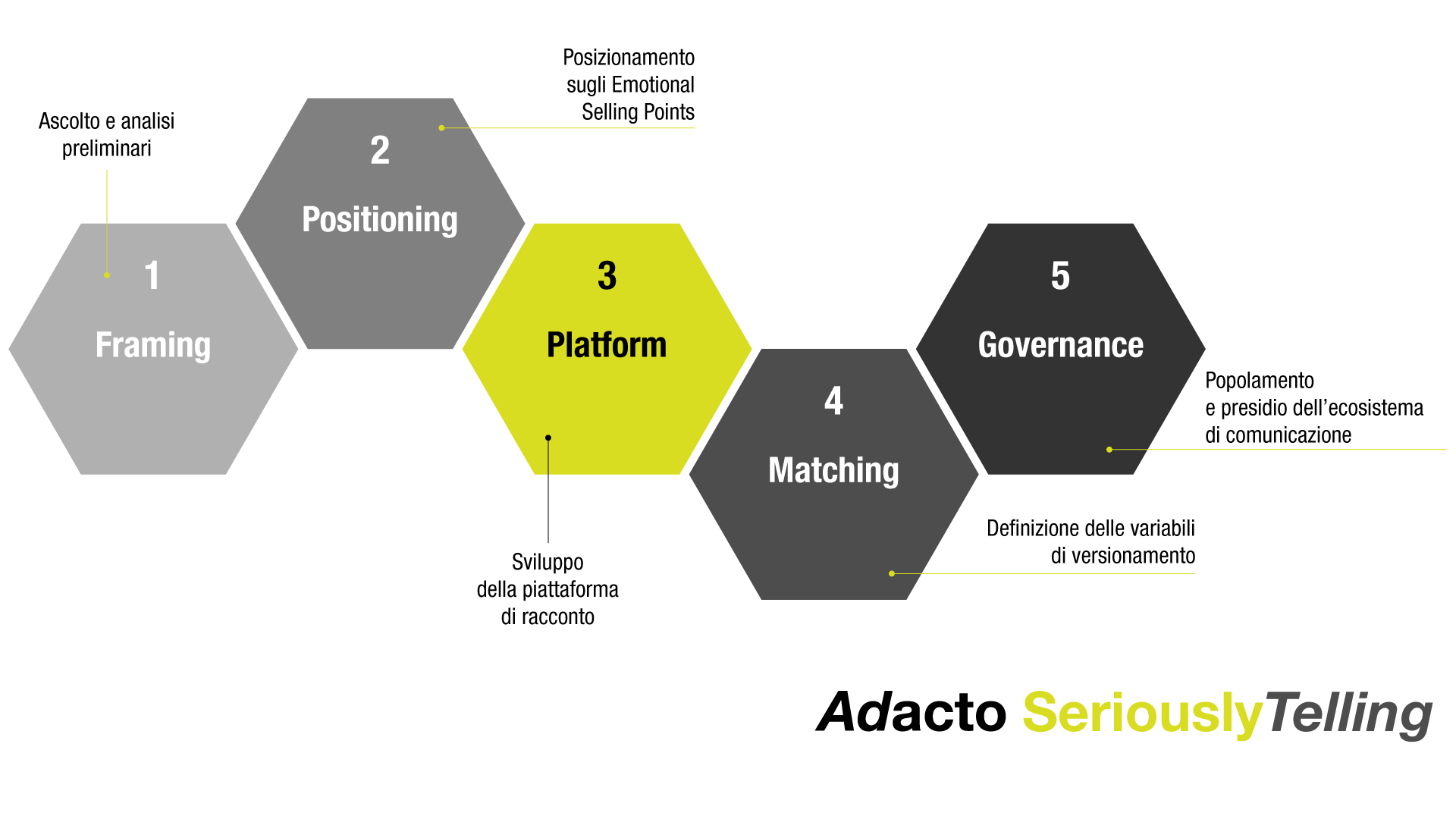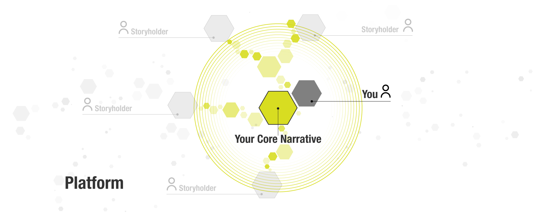 Il terzo step è la progettazione di una Narrative Platform, una piattaforma strategica che ci dice come “unire i puntini” correttamente, quali storyline principali possono avvicinare e condurre a te lo stoyholder, e quale core-narrative può dare coerenza e unità a questa rete di storie.